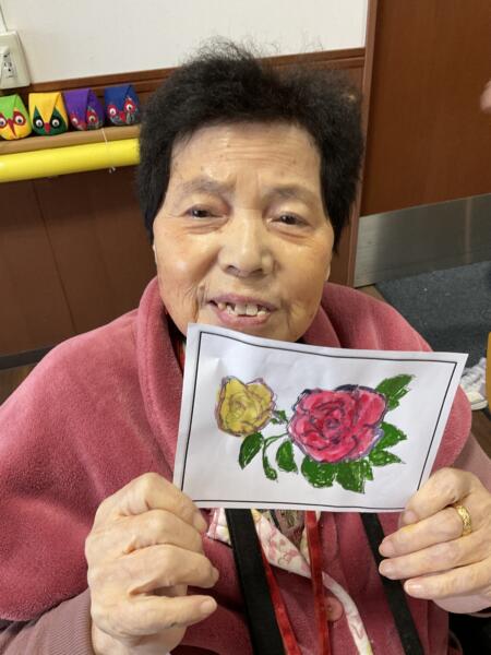 毎月人気の絵手紙作りの日、4月は「バラ」の色付けをしました。