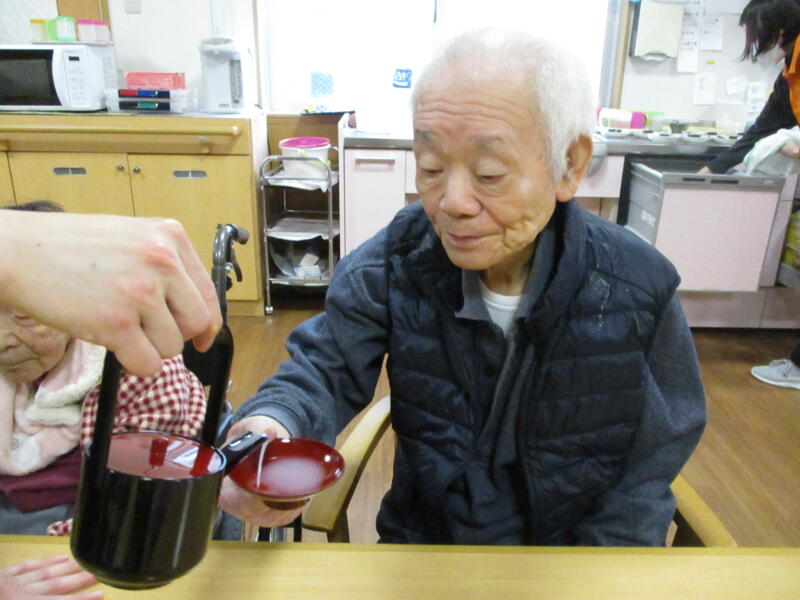 特養入居では、年明けにそれぞれの町で新年会を行いました。府中八幡神社の巫女様にお祓いをしていただき
